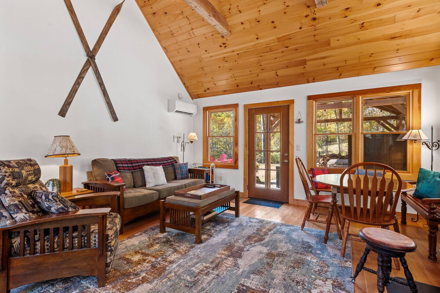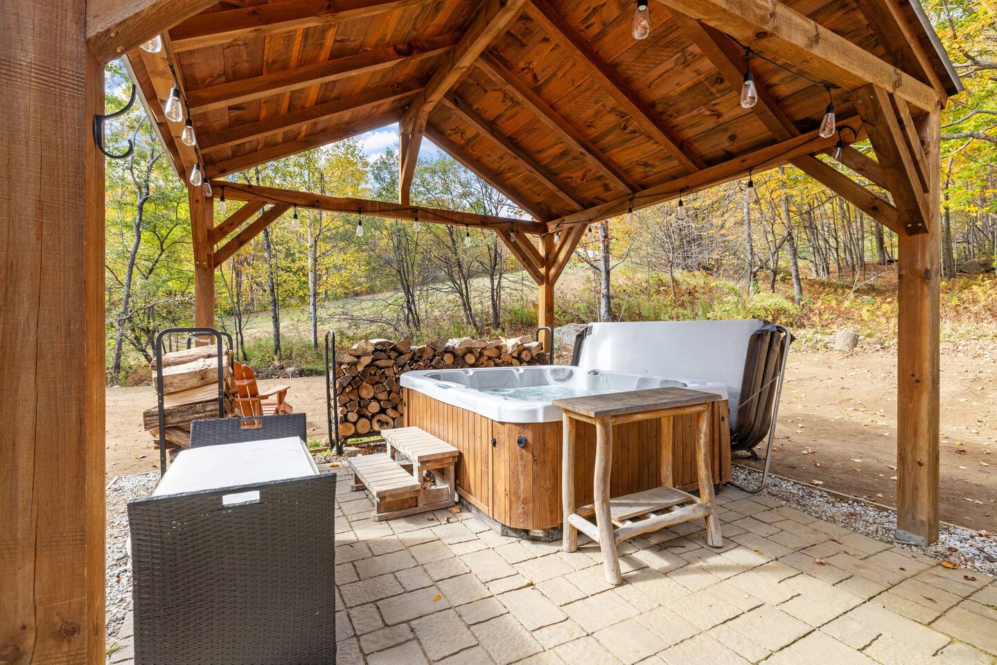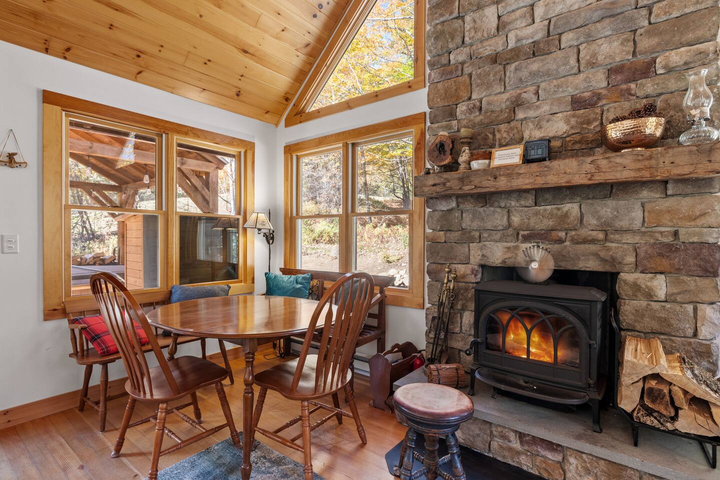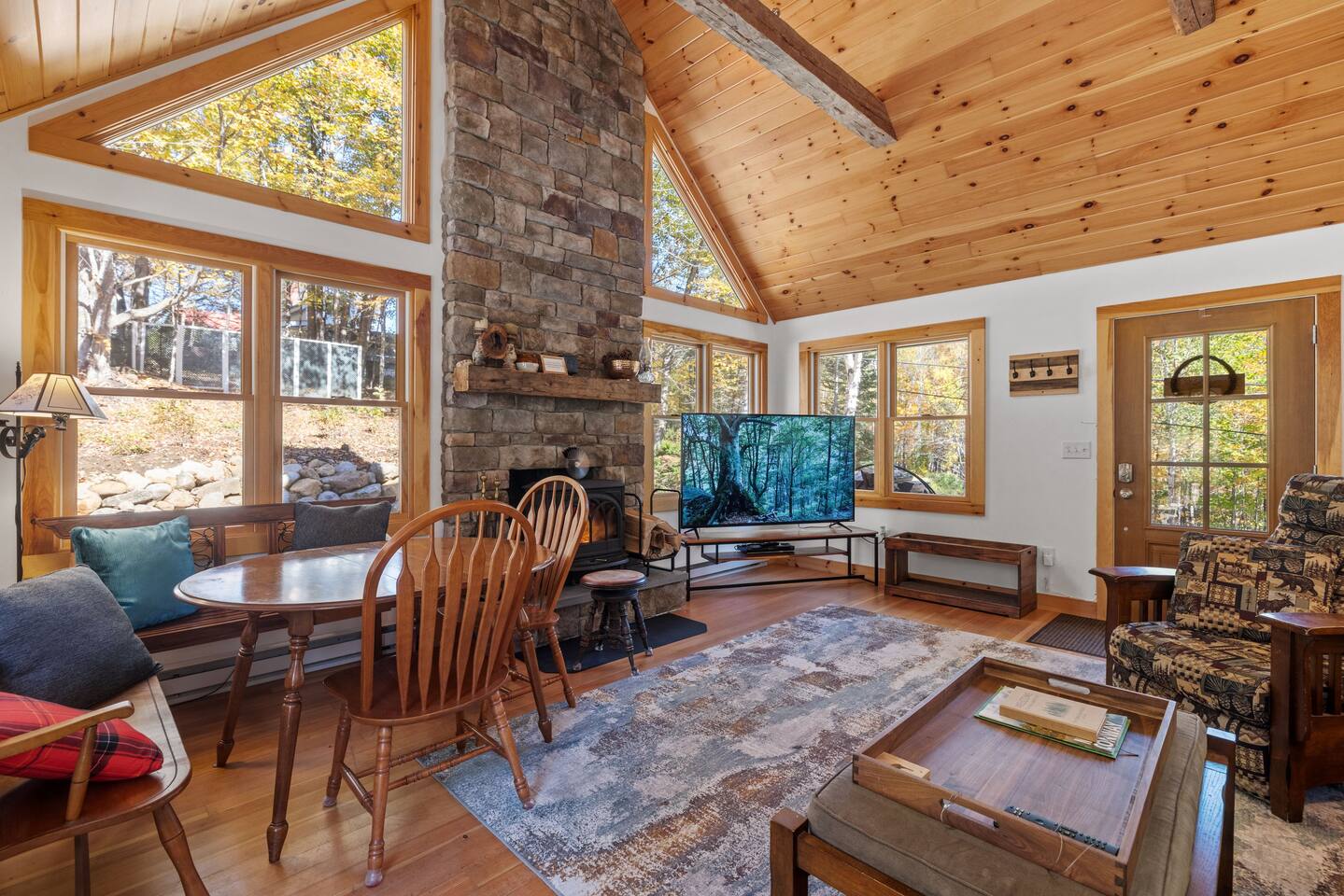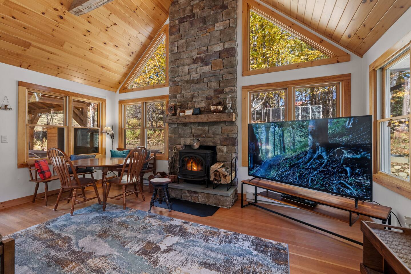 Discover a charming cottage nestled in a picturesque woodland with views of Black Mountain. The inviting vaulted room, adorned with a wood stove, serves as a cozy gathering spot. The pavilion and hot tub create a tranquil oasis, while the deck provides a serene escape with vistas of Black Mountain and the soothing sounds of babbling brooks. The master bedroom, a secluded loft, boasts its own full bath. Enjoy home-cooked meals in the fully equipped kitchen, perfect for dining with loved ones.