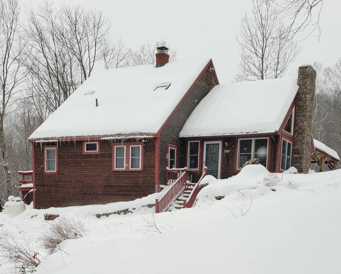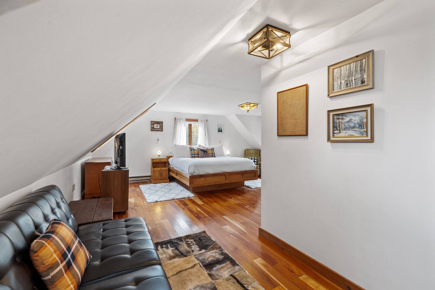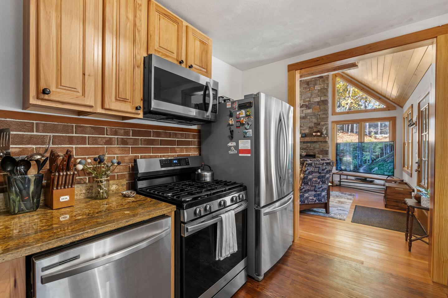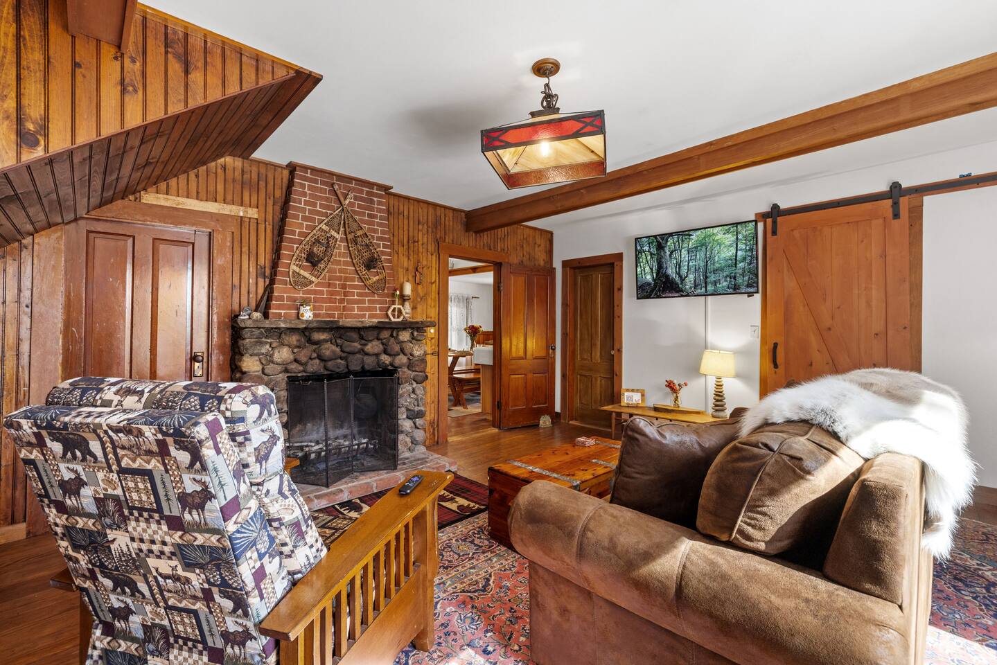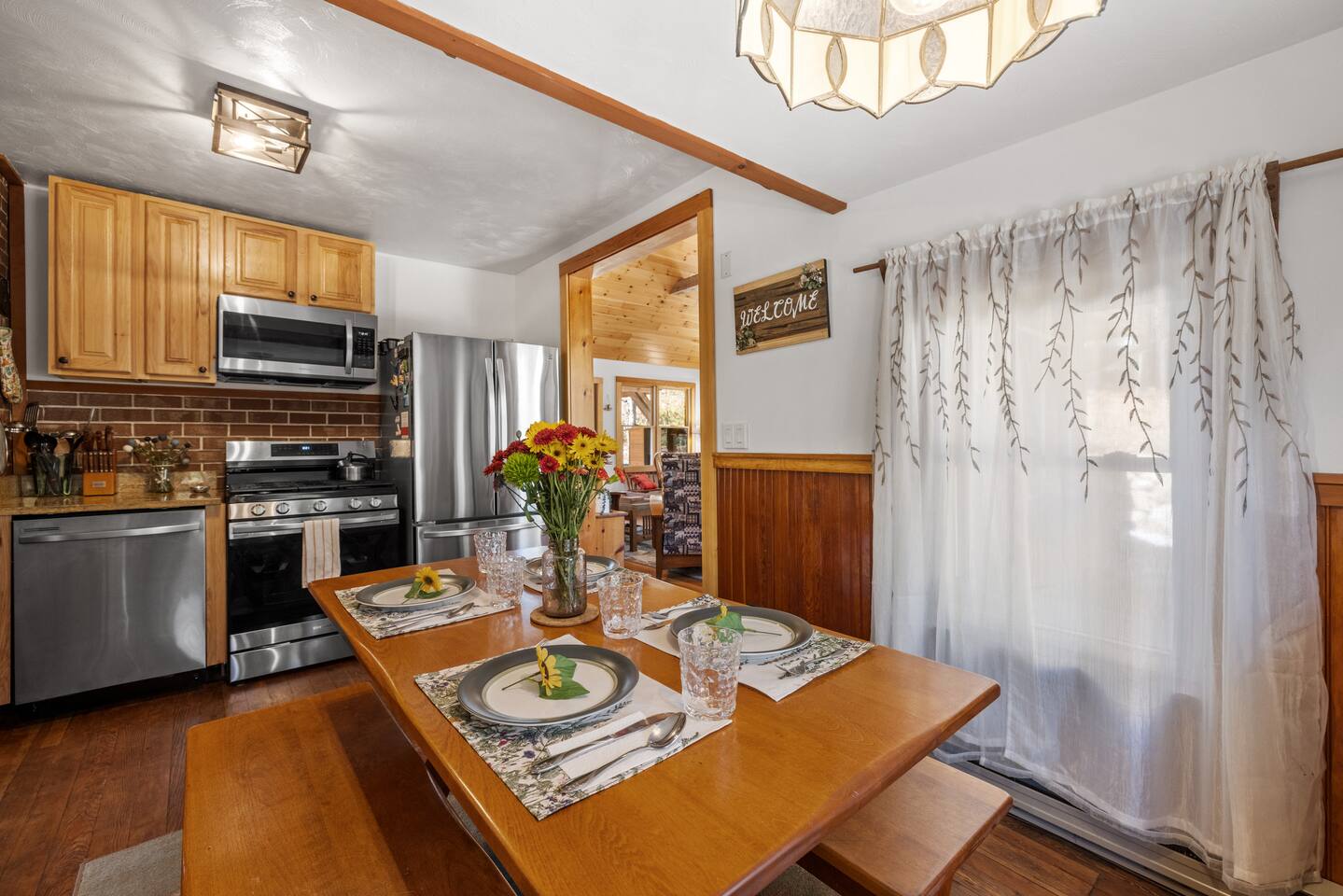 Discover a charming cottage nestled in a picturesque woodland with views of Black Mountain. The inviting vaulted room, adorned with a wood stove, serves as a cozy gathering spot. The pavilion and hot tub create a tranquil oasis, while the deck provides a serene escape with vistas of Black Mountain and the soothing sounds of babbling brooks. The master bedroom, a secluded loft, boasts its own full bath. Enjoy home-cooked meals in the fully equipped kitchen, perfect for dining with loved ones.