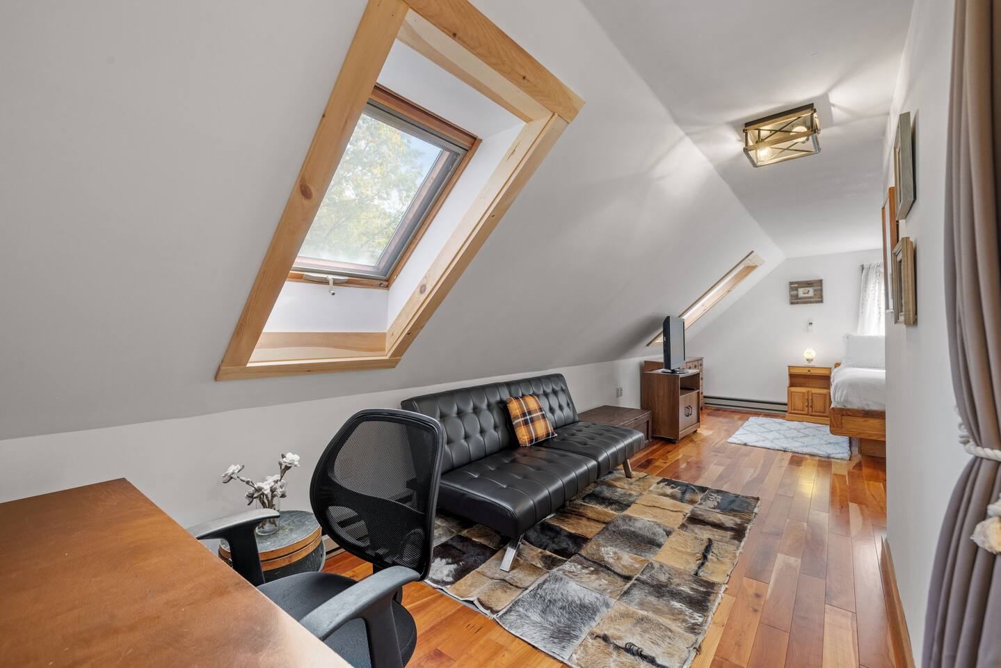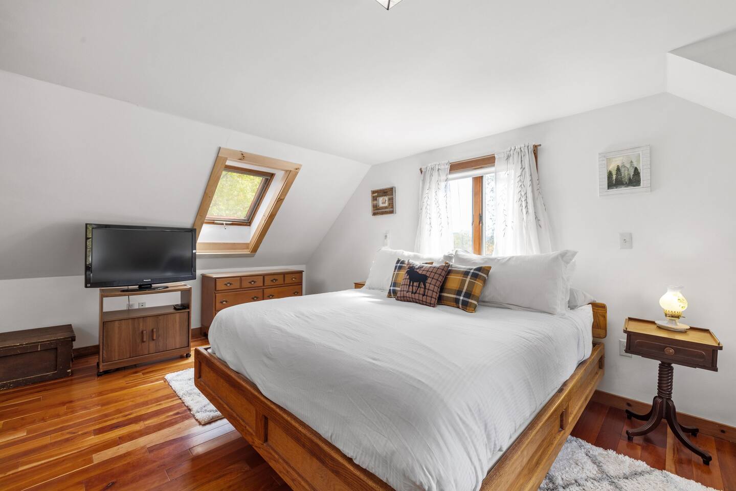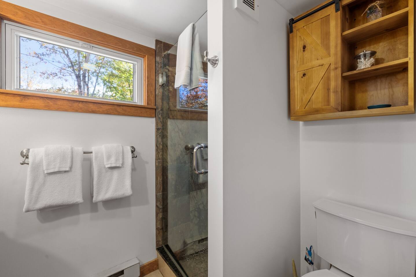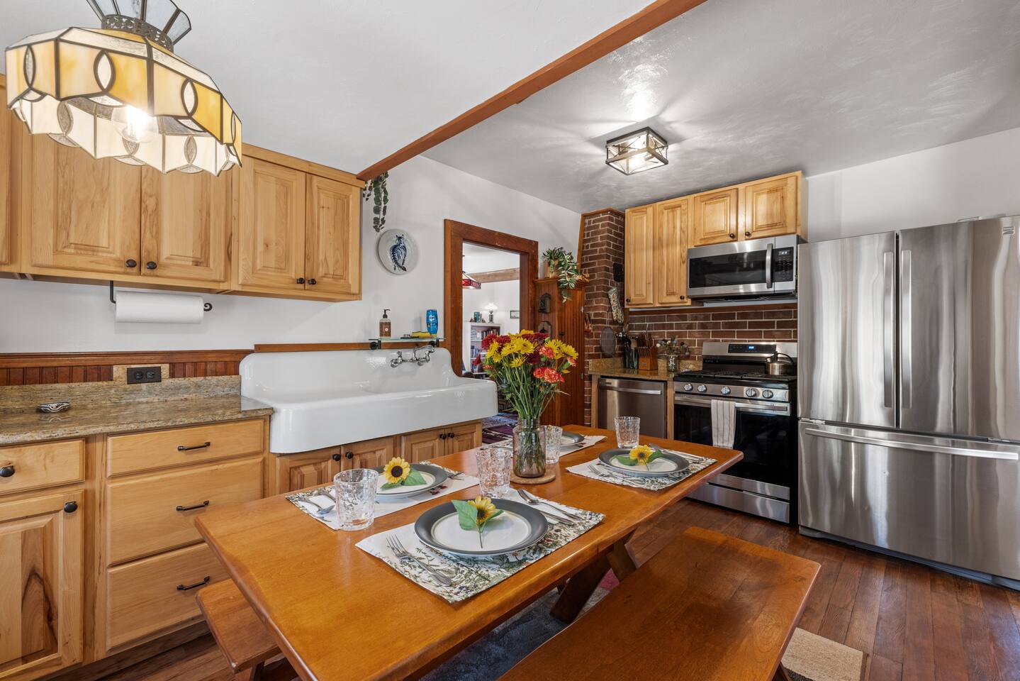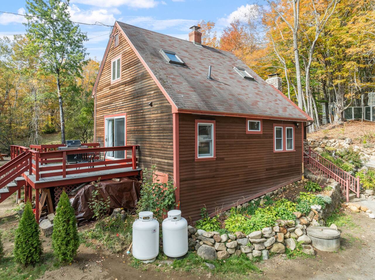 Discover a charming cottage nestled in a picturesque woodland with views of Black Mountain. The inviting vaulted room, adorned with a wood stove, serves as a cozy gathering spot. The pavilion and hot tub create a tranquil oasis, while the deck provides a serene escape with vistas of Black Mountain and the soothing sounds of babbling brooks. The master bedroom, a secluded loft, boasts its own full bath. Enjoy home-cooked meals in the fully equipped kitchen, perfect for dining with loved ones.